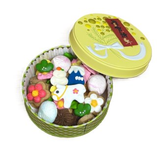 | 原材料 | 小麦粉(アメリカ製造)、砂糖、バター、マーガリン、ココアパウダー、鶏卵、牛乳、アーモンド粉、レモン、シナモン、寒天、ゼラチン、食塩 / 安定剤(増粘多糖類)、乳化剤(大豆由来)、加工デンプン、クエン酸、グリセリン、保存料(ソルビン酸k、安息香酸Na )、着色料(黄4、黄5、赤3、赤40、青1、青2、紅花黄、植物炭末色素、クチナシ、アナトー、銀箔) |